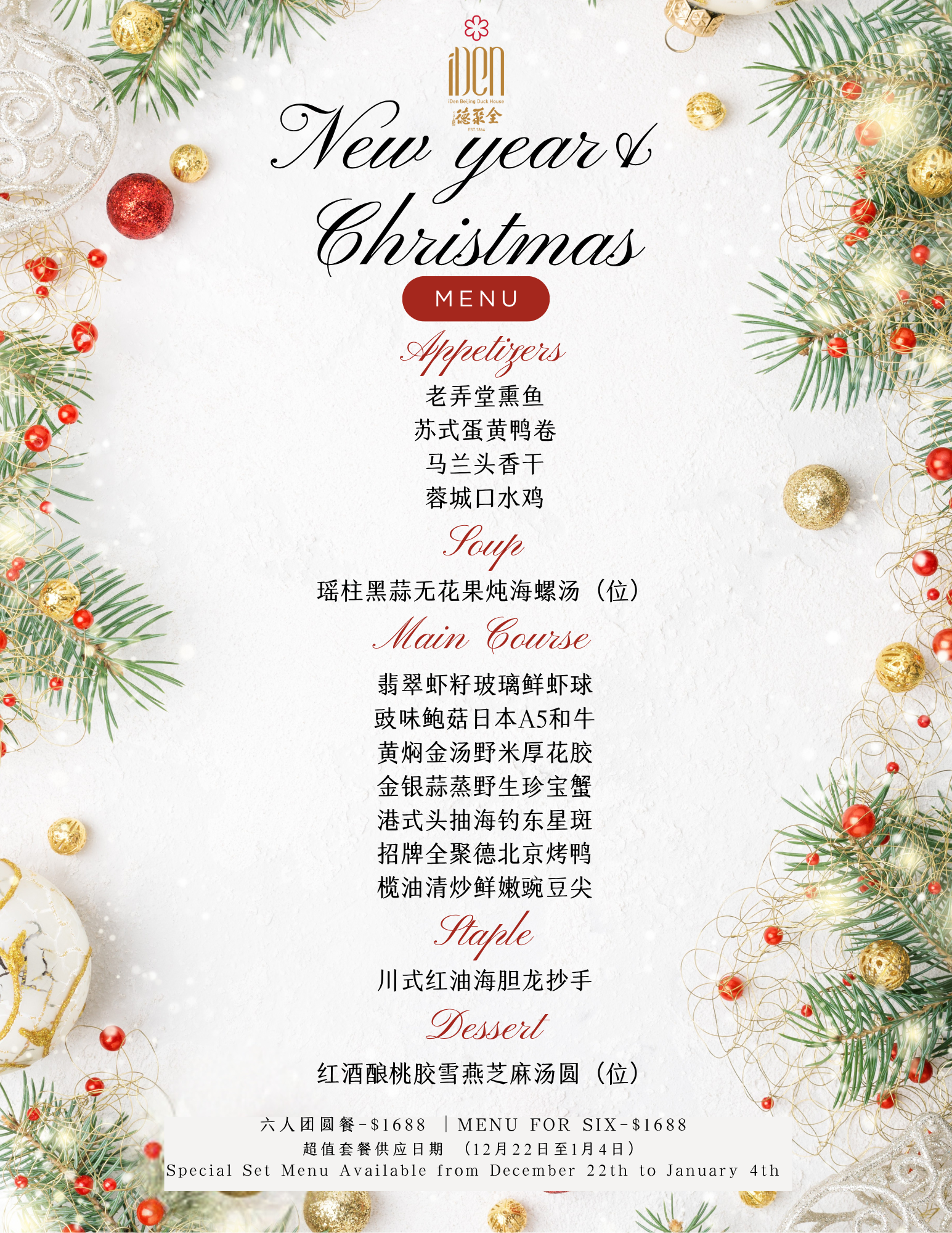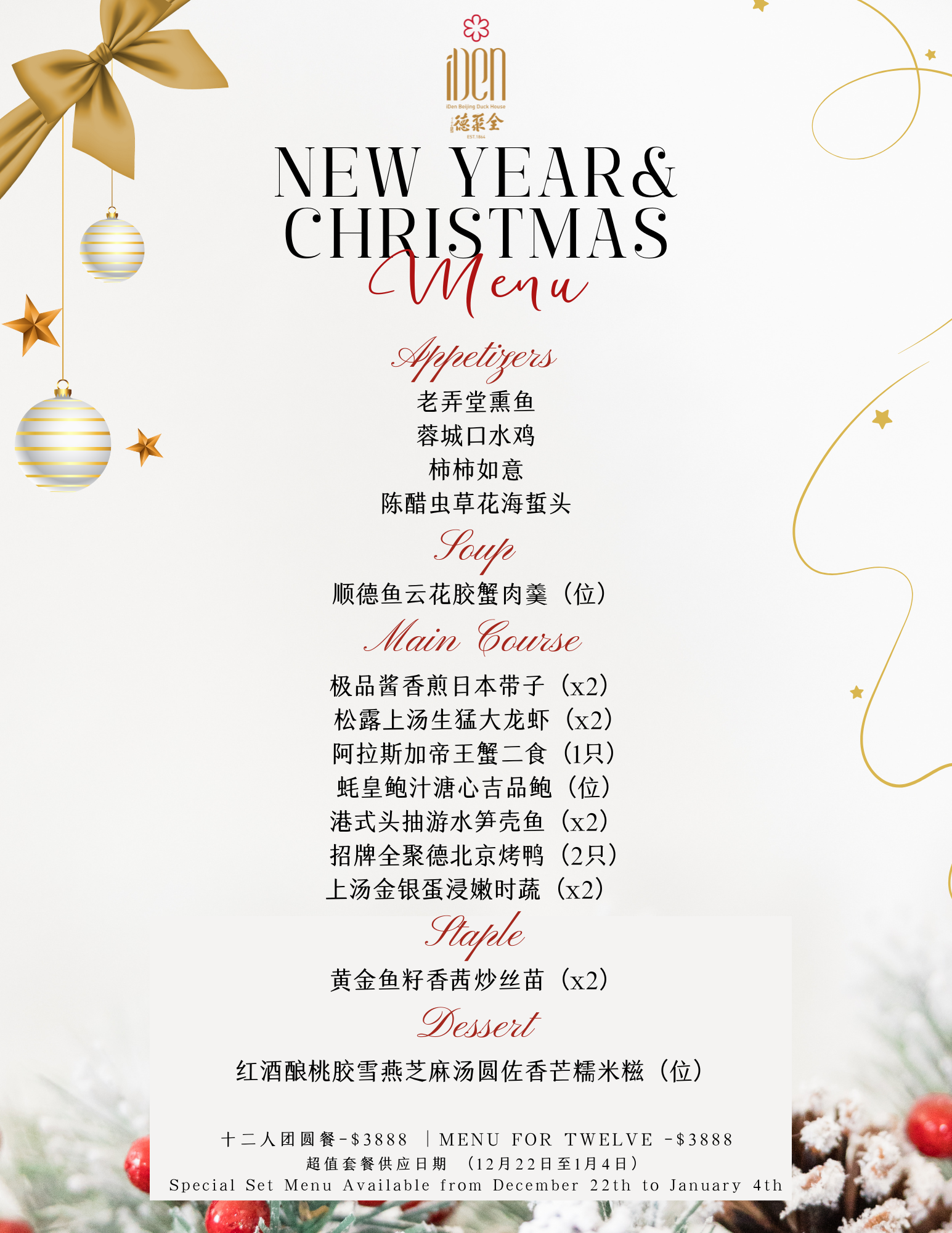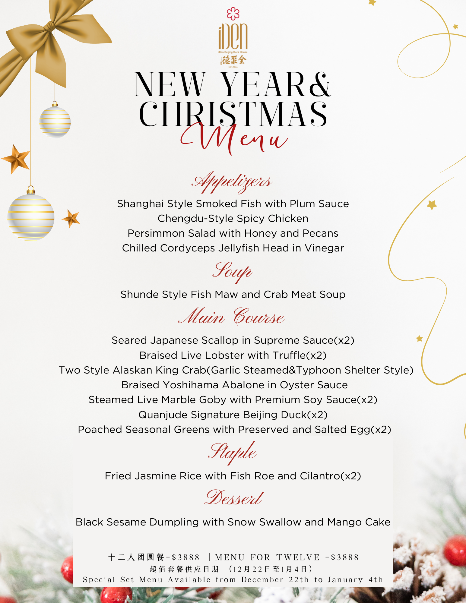 行政主厨圣诞新年祝福套餐-四人团圆餐 Christmas & New Year Menu- For Four 行政主厨圣诞新年祝福套餐-六人团圆餐 Christmas & New Year Menu- For Six 行政主厨圣诞新年祝福套餐-十二人团圆餐 Christmas & New Year Menu- For Twelve