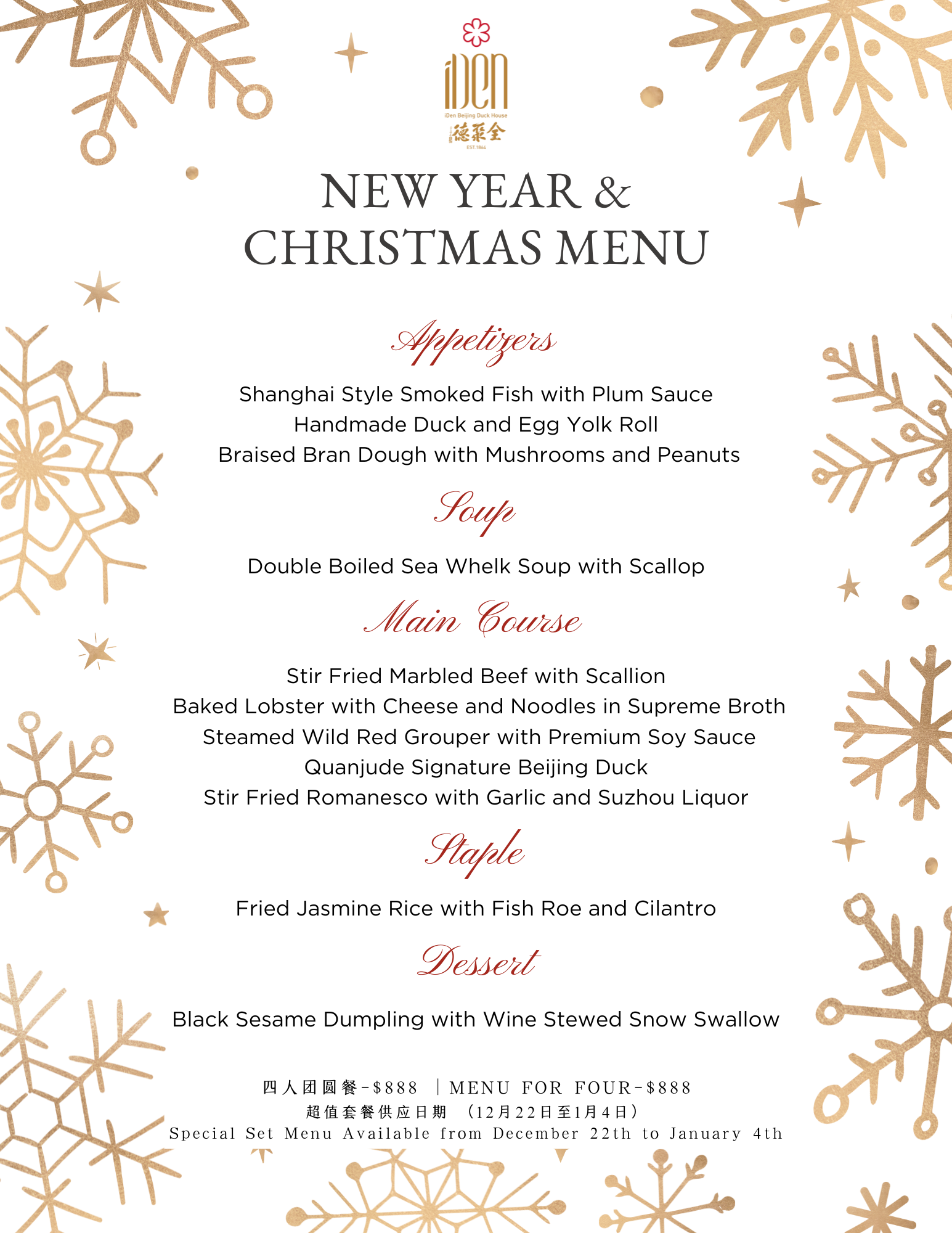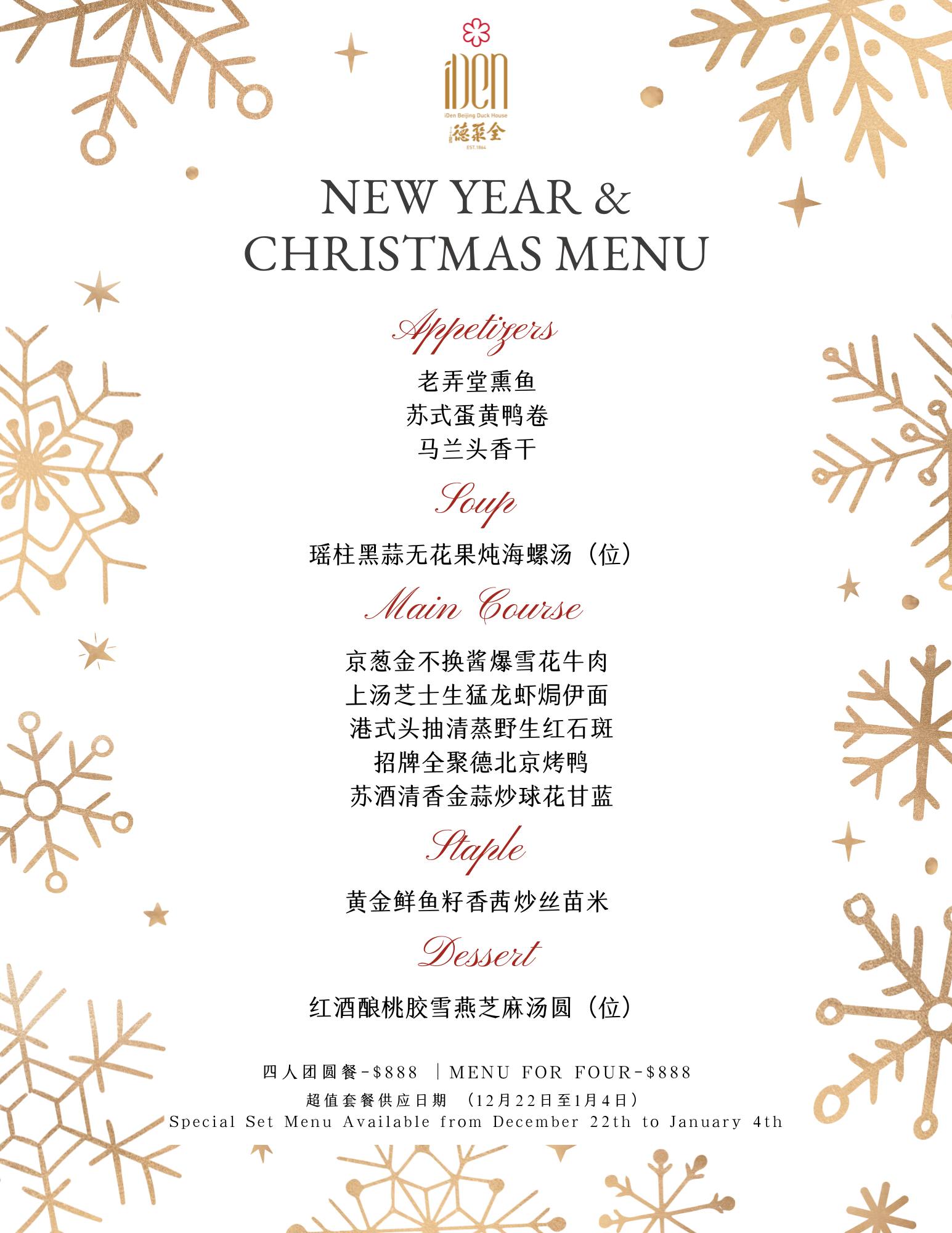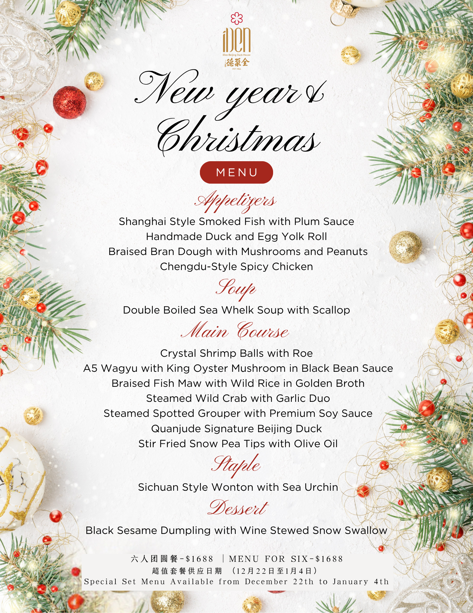 行政主厨圣诞新年祝福套餐-四人团圆餐 Christmas & New Year Menu- For Four 行政主厨圣诞新年祝福套餐-六人团圆餐 Christmas & New Year Menu- For Six 行政主厨圣诞新年祝福套餐-十二人团圆餐 Christmas & New Year Menu- For Twelve
