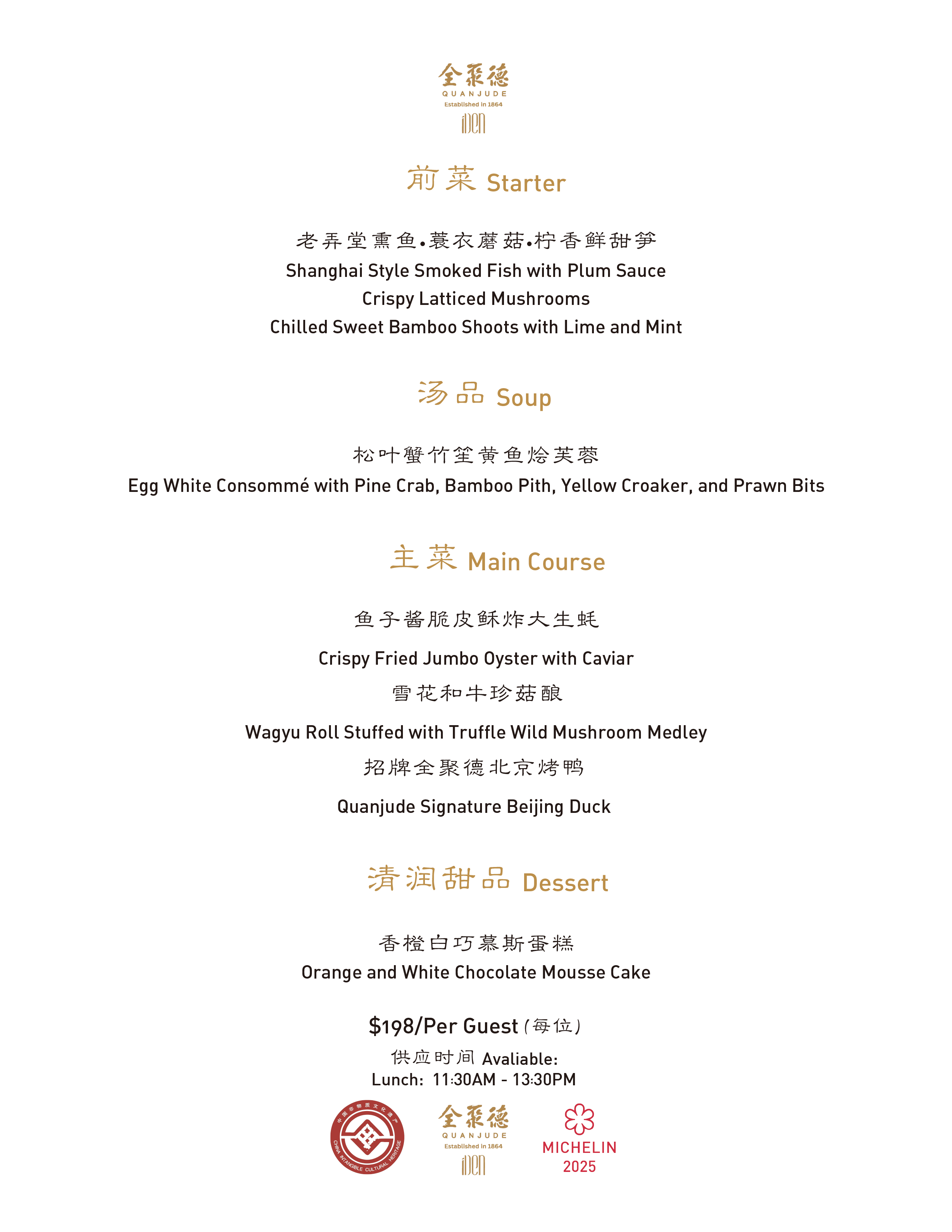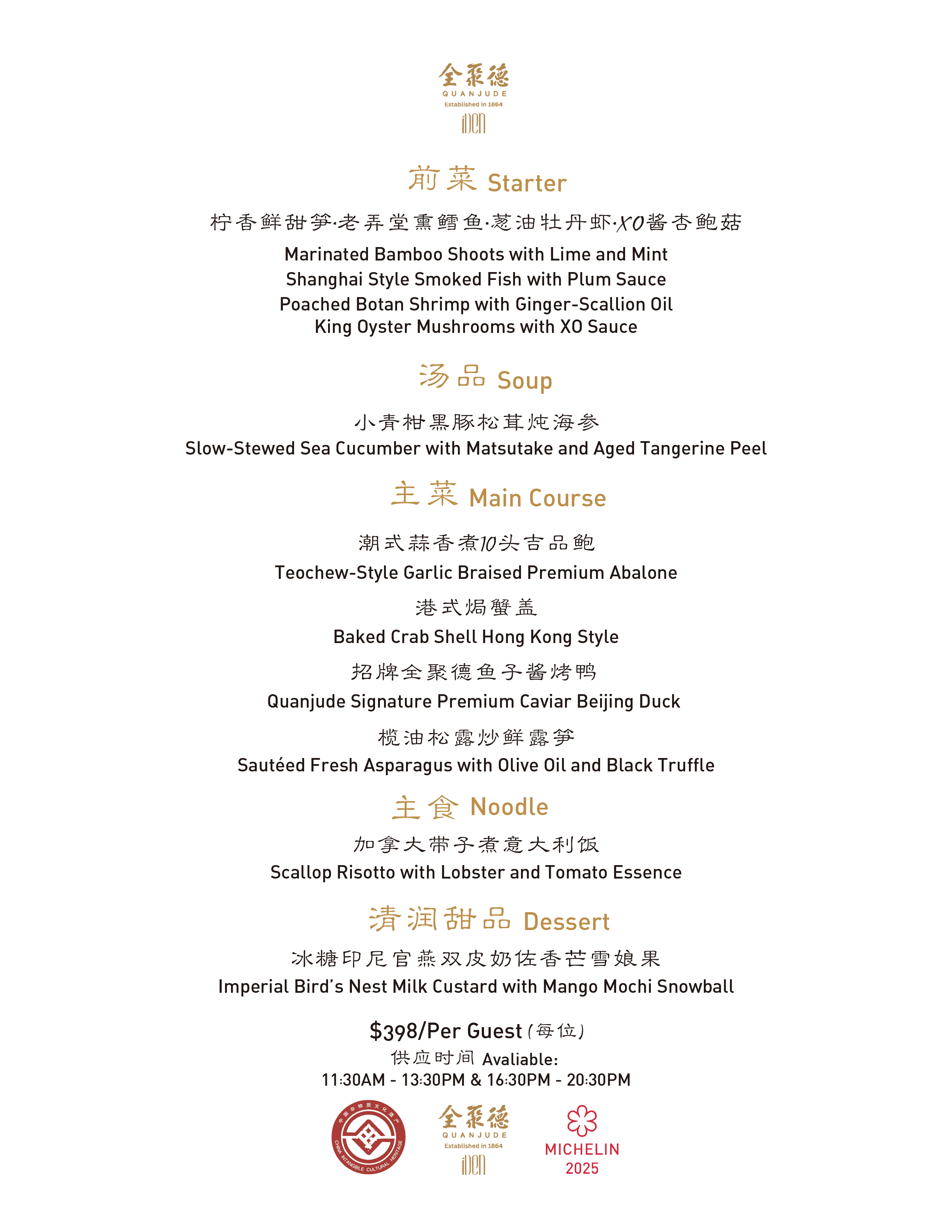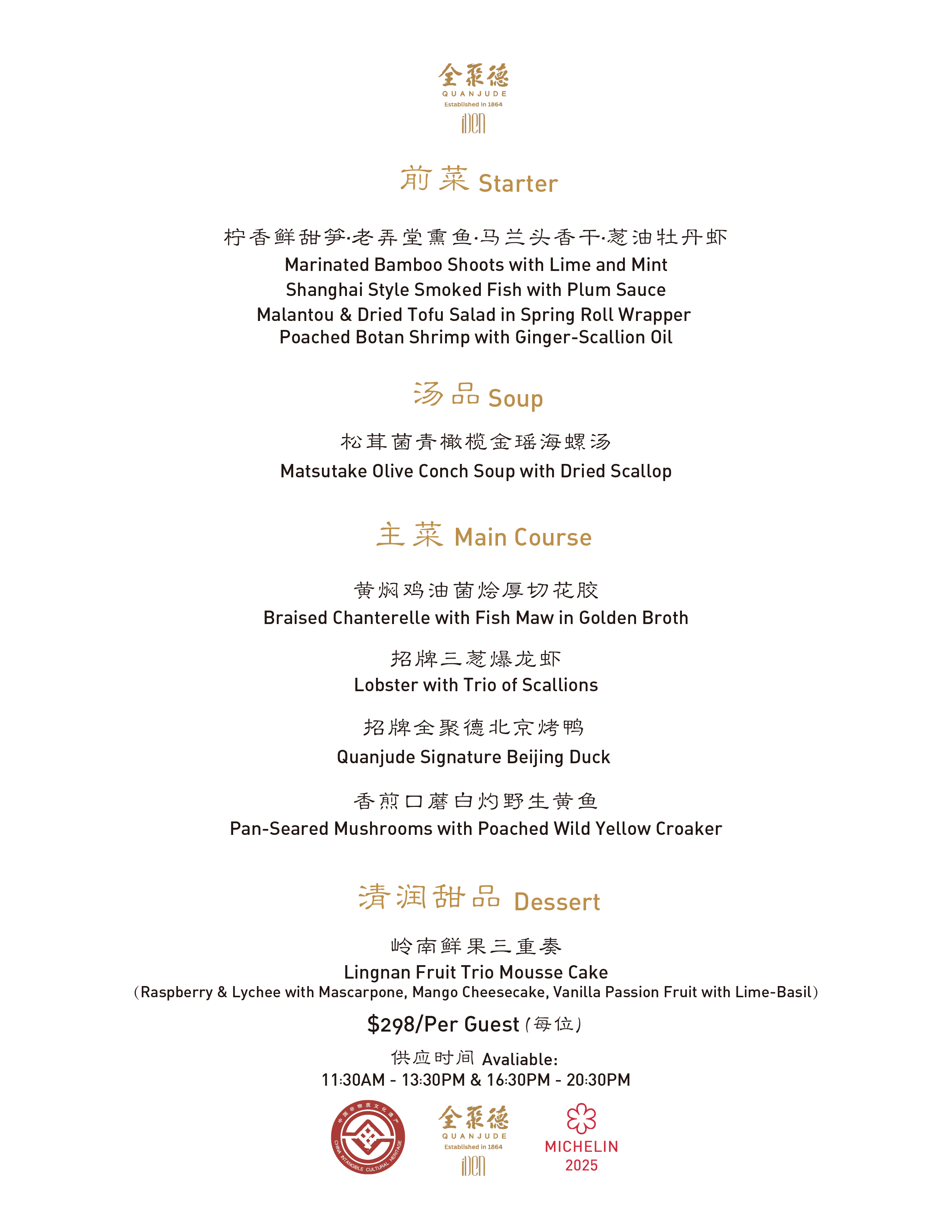 TASTING MENU 供应时间周一至周日Avaliable time Mon-Sun: 11:30 AM – 13:30 PM & 16:00PM – 20:30PM Tasting Menu Last call 21:00